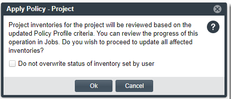 • The Apply Policy - Project confirmation pop-up window is displayed, explaining the operation and providing the option not to overwrite a current review status that was manually set for an inventory item within the project.
